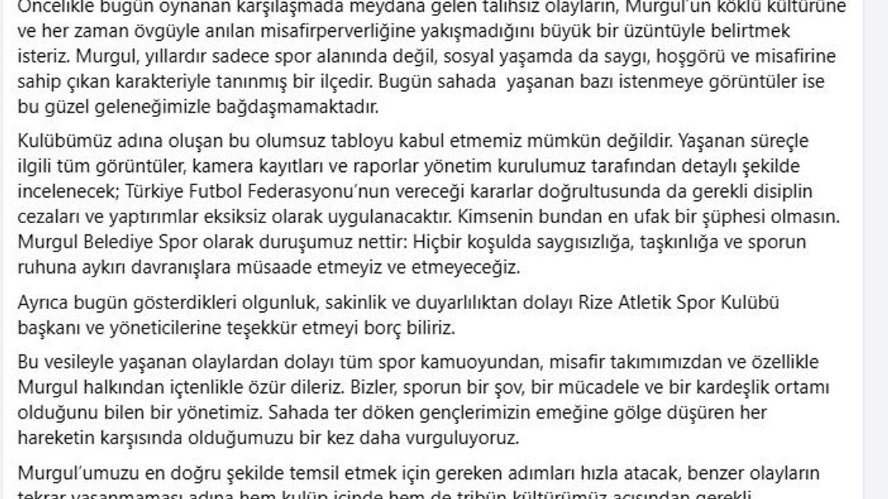“Öncelikle bugün oynanan karşılaşmada meydana gelen talihsiz olayların, Murgul’un köklü kültürüne ve her zaman övgüyle anılan misafirperverliğine yakışmadığını büyük bir üzüntüyle belirtmek isteriz. Murgul, yıllardır sadece spor alanında değil, sosyal yaşamda da saygı, hoşgörü ve misafirine sahip çıkan karakteriyle tanınmış bir ilçedir. Bugün sahada yaşanan bazı istenmeye görüntüler ise bu güzel geleneğimizle bağdaşmamaktadır. Kulübümüz adına oluşan bu olumsuz tabloyu kabul etmemiz mümkün değildir. Yaşanan süreçle ilgili tüm görüntüler, kamera kayıtları ve raporlar yönetim kurulumuz tarafından detaylı şekilde incelenecek; Türkiye Futbol Federasyonu’nun vereceği kararlar doğrultusunda da gerekli disiplin cezaları ve yaptırımlar eksiksiz olarak uygulanacaktır. Kimsenin bundan en ufak bir şüphesi olmasın. Murgul Belediyespor olarak duruşumuz nettir. Hiçbir koşulda saygısızlığa, taşkınlığa ve sporun ruhuna aykırı davranışlara müsaade etmeyiz ve etmeyeceğiz. Ayrıca bugün gösterdikleri olgunluk, sakinlik ve duyarlılıktan dolayı Rize Atletik Spor Kulübü Başkanı ve yöneticilerine teşekkür etmeyi borç biliriz. Bu vesileyle yaşanan olaylardan dolayı tüm spor kamuoyundan, misafir takımımızdan ve özellikle Murgul halkından içtenlikle özür dileriz.”