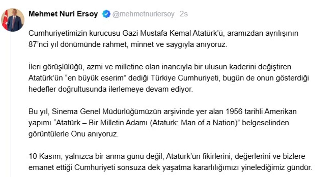 Bakan Ersoy, Atatürk'ü vefatının 87'nci yıl dönümünde, Atatürk'ün geçici istirahatgahından Anıtkabir'e taşınmasına ilişkin görüntülerle hazırlanan belgeselin bir bölümünü sosyal medya hesabından paylaşarak andı. Ersoy, "İleri görüşlülüğü, azmi ve milletine olan inancıyla bir ulusun kaderini değiştiren Atatürk’ün ‘en büyük eserim’ dediği Türkiye Cumhuriyeti, bugün de onun gösterdiği hedefler doğrultusunda ilerlemeye devam ediyor. Bu yıl, Sinema Genel Müdürlüğümüzün arşivinde yer alan 1956 tarihli Amerikan yapımı ‘Atatürk -Bir Milletin Adamı (Ataturk: Man of a Nation)’ belgeselinden görüntülerle Onu anıyoruz. 10 Kasım; yalnızca bir anma günü değil, Atatürk’ün fikirlerini, değerlerini ve bizlere emanet ettiği Cumhuriyeti sonsuza dek yaşatma kararlılığımızı yinelediğimiz gündür" ifadelerini kullandı. (DHA)