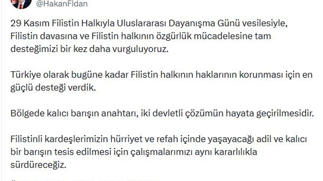 ANKARA, (DHA)- DIŞİŞLERİ Bakanı Hakan Fidan, "29 Kasım Filistin Halkıyla Uluslararası Dayanışma Günü vesilesiyle, Filistin davasına ve Filistin halkının özgürlük mücadelesine tam desteğimizi bir kez daha vurguluyoruz" dedi.