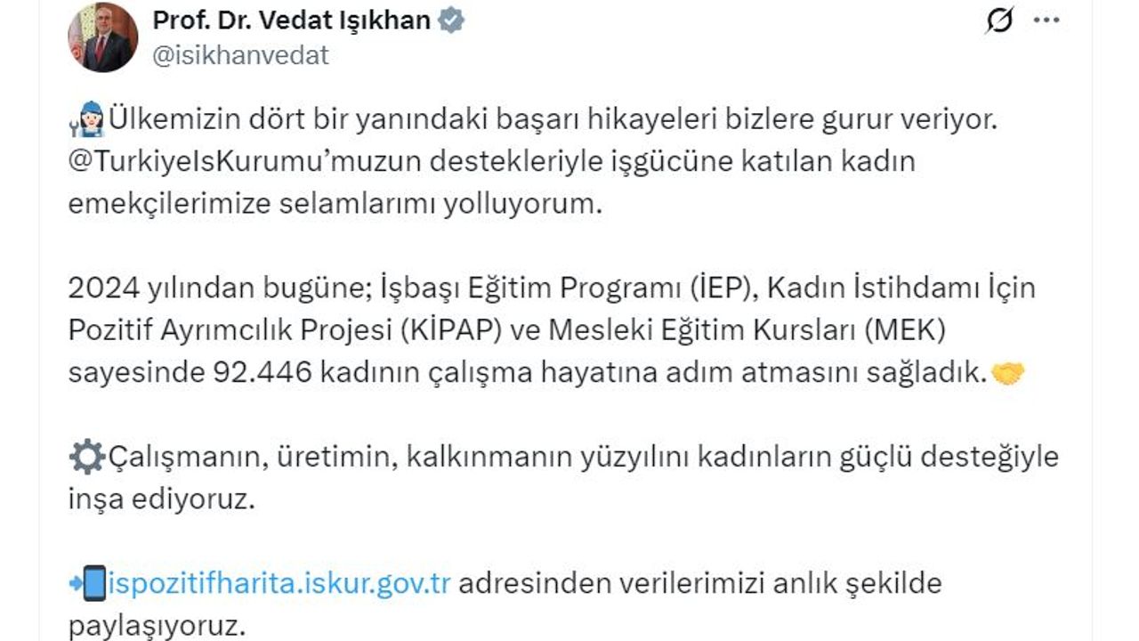 ANKARA, (DHA)- ÇALIŞMA ve Sosyal Güvenlik Bakanı Vedat Işıkhan, 2024 yılından bugüne kadar İşbaşı Eğitim Programı, Kadın İstihdamı İçin Pozitif Ayrımcılık Projesi ve Mesleki Eğitim Kursları sayesinde 92 bin 446 kadının çalışma hayatına kazandırıldığını duyurdu.