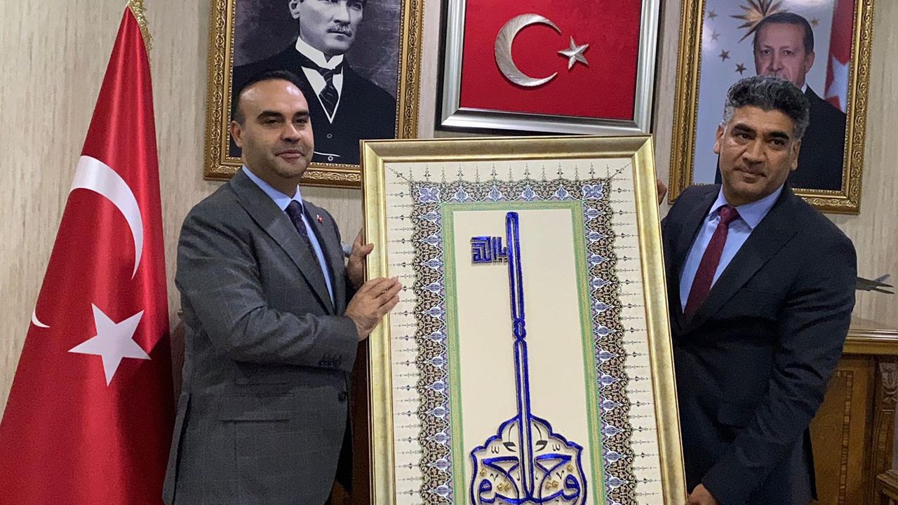 AK Parti İl Başkanı Ali Kemal Ayaz, ziyaret anısına Bakan Kacır’a anahtar şeklinde üzerinde Ya Allah, Ya Fettah’ yazılı bir tablo hediye etti.