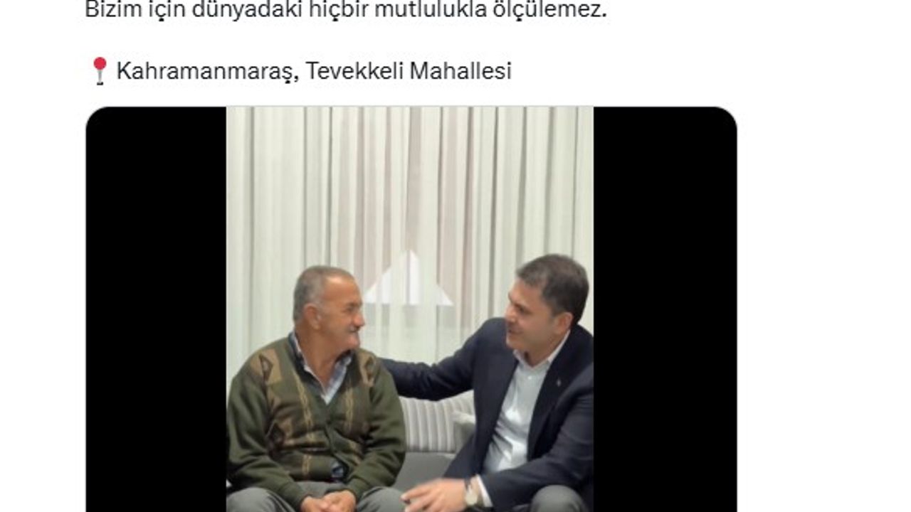 Afet konutlarının inşa çalışmalarındaki son durumu incelemek için Kahramanmaraş'a giden Bakan Kurum, depremin ardından çekilen görüntülerde çadırlarının önünde gözyaşı döken Mehmet ve Hatice Koyunlu çiftinin, yeni yapılan köy evine konuk oldu. Ziyaretine ilişkin sosyal medya hesabından paylaşım yapan Kurum, "O günlerde acılarına ortak olduğumuz bu güzel aileleri şimdi huzur içinde, güvenli yuvalarında görmek. Bizim için dünyadaki hiçbir mutlulukla ölçülemez" dedi.