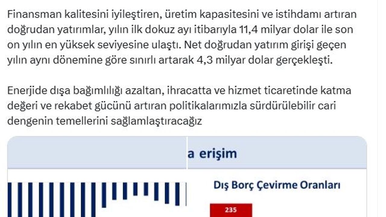 ANKARA, (DHA)- HAZİNE ve Maliye Bakanı Mehmet Şimşek, "Finansman kalitesini iyileştiren, üretim kapasitesini ve istihdamı artıran doğrudan yatırımlar, yılın ilk dokuz ayı itibarıyla 11,4 milyar dolar ile son 10 yılın en yüksek seviyesine ulaştı" dedi.