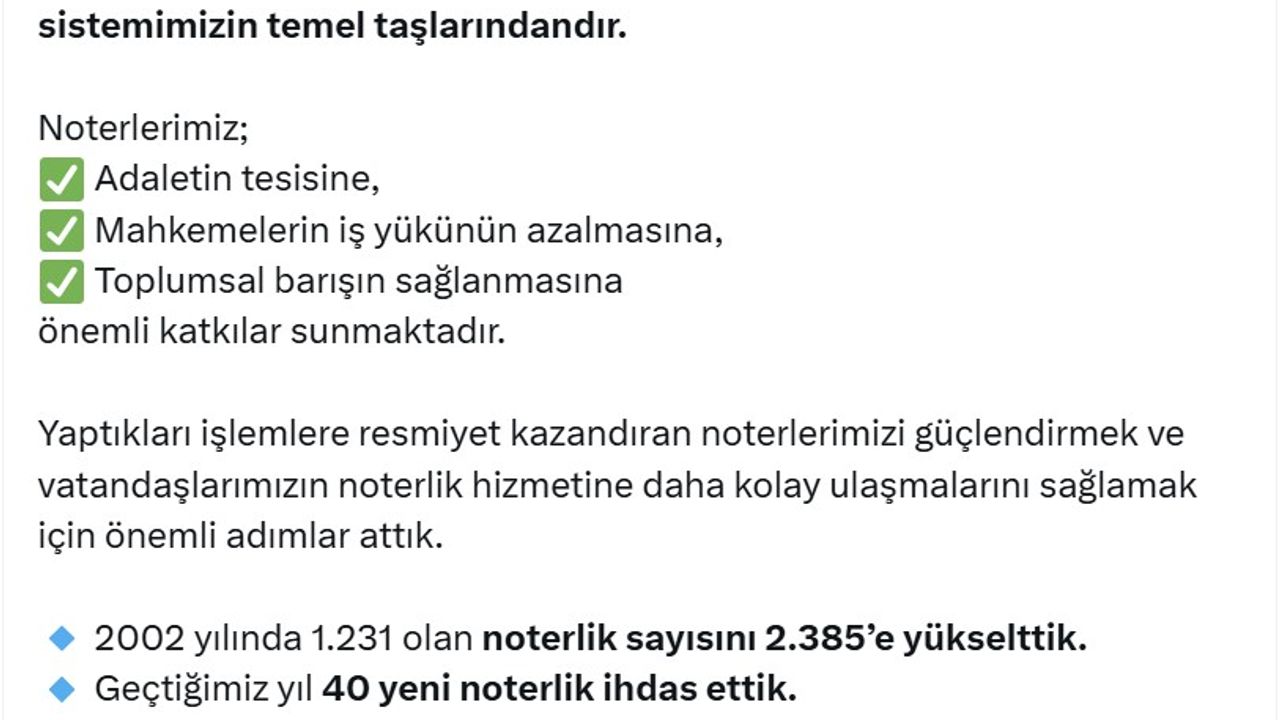 Bakan Tunç, sosyal medya hesabından yaptığı açıklamada, "Noterlik, adaletin sağlanması ve korunması açısından hukuk sistemimizin temel taşlarındandır. Noterlerimiz; adaletin tesisine, mahkemelerin iş yükünün azalmasına ve toplumsal barışın sağlanmasına önemli katkılar sunmaktadır. Yaptıkları işlemlere resmiyet kazandıran noterlerimizi güçlendirmek ve vatandaşlarımızın noterlik hizmetine daha kolay ulaşmalarını sağlamak için önemli adımlar attık. 2002 yılında 1231 olan noterlik sayısını 2 bin 385'e yükselttik. Geçen yıl 40 yeni noterlik ihdas ettik. Noterlik hizmetlerinin daha etkin ve verimli yürütülmesi amacıyla 6 Nisan 2019 tarihinde başlattığımız nöbetçi noterlik uygulamasıyla vatandaşlarımızın hafta sonları da noterlik hizmetine ulaşabilmesini sağladık ve bu kapsamda bugüne kadar 3 milyon 960 bin 246 işlem gerçekleştirildi" ifadelerini kullandı.
