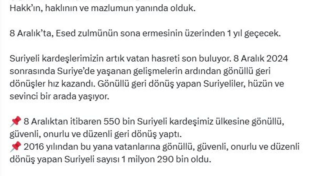 İçişleri Bakanı Ali Yerlikaya, Kahramanmaraş Gönüllü Geri Dönüş Koordinasyon Merkezi'ndeki çalışmalara ilişkin sosyal medya hesabından video paylaştı. Bakan Yerlikaya paylaşımında, "Zulmün, açlığın ve savaşın kıyısında olanlara, gönül coğrafyamıza asla sırtımızı dönmedik. Hakk'ın, haklının ve mazlumun yanında olduk. 8 Aralık'ta, Esed zulmünün sona ermesinin üzerinden 1 yıl geçecek. Suriyeli kardeşlerimizin artık vatan hasreti son buluyor. 8 Aralık 2024 sonrasında Suriye'de yaşanan gelişmelerin ardından gönüllü geri dönüşler hız kazandı. Gönüllü geri dönüş yapan Suriyeliler, hüzün ve sevinci bir arada yaşıyor. 8 Aralık’tan itibaren 550 bin Suriyeli kardeşimiz ülkesine gönüllü, güvenli, onurlu ve düzenli geri dönüş yaptı. 2016 yılından bu yana vatanlarına gönüllü, güvenli, onurlu ve düzenli dönüş yapan Suriyeli sayısı 1 milyon 290 bin oldu. Ülkemiz, göç yönetiminde Cumhurbaşkanımız Sayın Recep Tayyip Erdoğan'ın liderliğinde; tarihsel tecrübesi, insani yaklaşımı ve rasyonel bakış açısıyla dünyaya örnek bir model ortaya koymaktadır. Tüm illerimizde Suriyeli kardeşlerimizin gönüllü geri dönüş işlemlerini Göç İdaresi Başkanlığımız koordinesinde büyük bir hassasiyetle yürütüyoruz" ifadelerine yer verdi.
