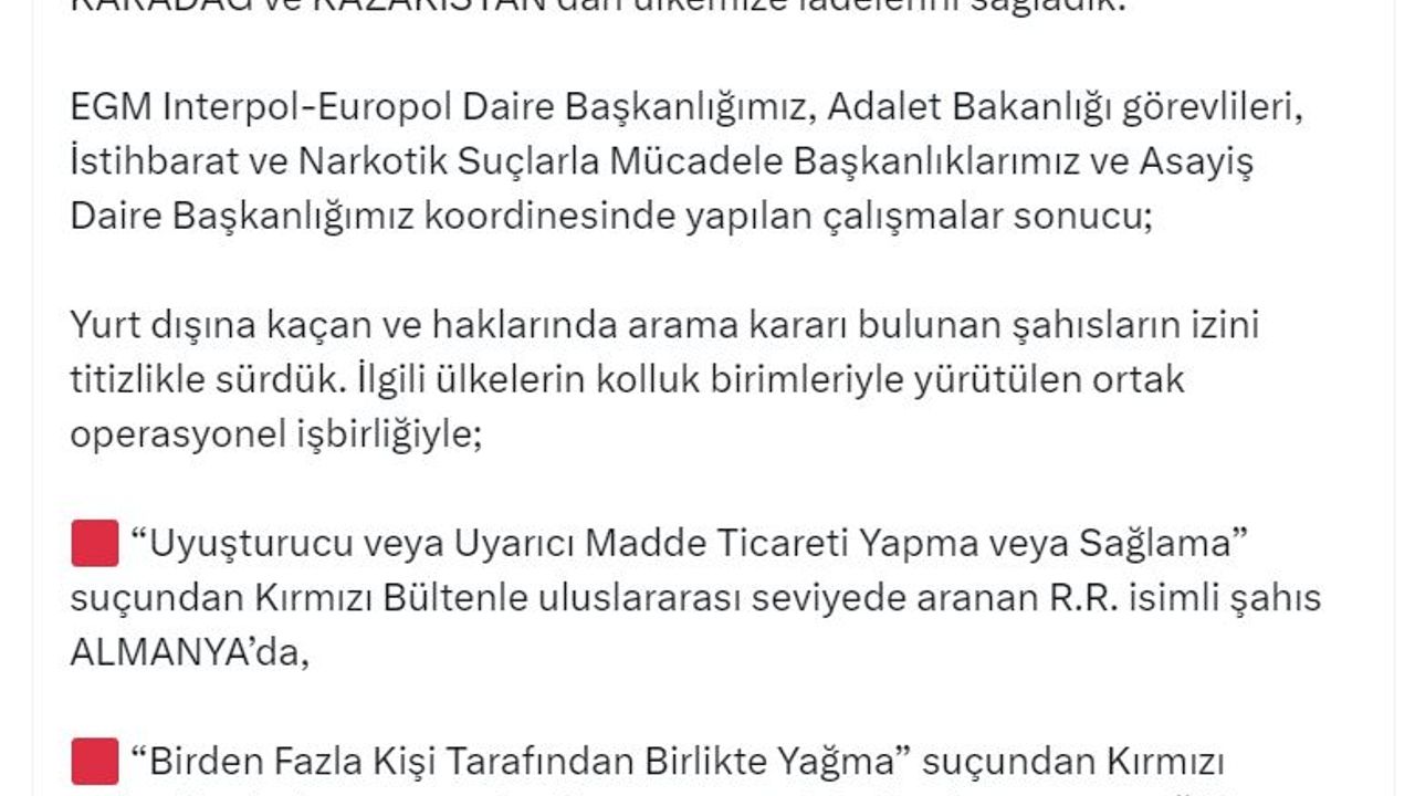Bakan Yerlikaya, sosyal medya hesabından yaptığı açıklamada, bu kabine döneminde kırmızı bülten ve difizyonla aranan 500 suçluyu Türkiye'ye geri getirdiklerini belirterek, "EGM Interpol-Europol Daire Başkanlığımız, Adalet Bakanlığı görevlileri, İstihbarat ve Narkotik Suçlarla Mücadele Başkanlıklarımız ve Asayiş Daire Başkanlığımız koordinesinde yapılan çalışmalar sonucu; yurt dışına kaçan ve haklarında arama kararı bulunan şahısların izini titizlikle sürdük. İlgili ülkelerin kolluk birimleriyle yürütülen ortak operasyonel iş birliğiyle; 'Uyuşturucu veya uyarıcı madde ticareti yapma veya sağlama' suçundan kırmızı bültenle uluslararası seviyede aranan R.R. isimli şahıs Almanya'da, 'Birden fazla kişi tarafından birlikte yağma' suçundan kırmızı bültenle uluslararası seviyede aranan T.B. isimli şahıs Karadağ'da, 'Kasten öldürmeye teşebbüs' suçundan kırmızı bültenle uluslararası seviyede aranan Y.E.A. isimli şahıs Kazakistan'da yakalandı ve ülkemize iadeleri sağlandı" dedi.
