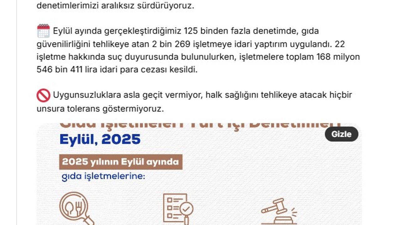 Tarım ve Orman Bakanı Yumaklı, NSosyal hesabından yaptığı açıklamada, "Vatandaşlarımızın sofrasına ulaşan her gıdanın güvenilirliğini sağlamak için denetimlerimizi aralıksız sürdürüyoruz. Eylül ayında gerçekleştirdiğimiz 125 binden fazla denetimde, gıda güvenilirliğini tehlikeye atan 2 bin 269 işletmeye idari yaptırım uygulandı. 22 işletme hakkında suç duyurusunda bulunulurken, işletmelere toplam 168 milyon 546 bin 411 lira idari para cezası kesildi. Uygunsuzluklara asla geçit vermiyor, halk sağlığını tehlikeye atacak hiçbir unsura tolerans göstermiyoruz" ifadelerini kullandı. (DHA)
