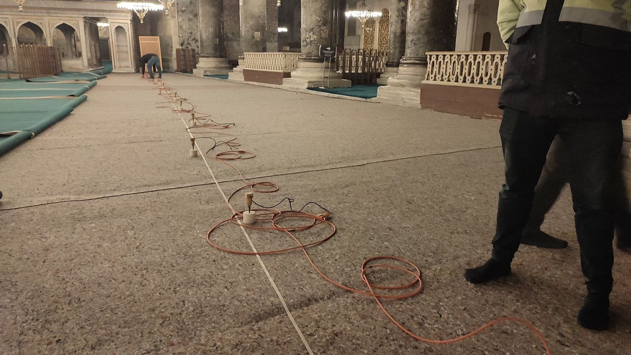 Bu doğrultuda geçici çelik konstrüksiyonu taşıyacak 43,5 metre yüksekliğinde 4 ana kolonun cami içinde ibadeti engellemeyecek şekilde inşasına Bilim Kurulunca karar verildiğine vurgu yapılarak, "43,5 metre yükseklikteki sistemin kurulumu ve çelik malzemelerin taşınması için iş makinesi kullanımı gerekliliği tespit edilmiş ve yapının batı yönünden itibaren bir giriş güzergahı oluşturulmasına karar verilmiştir. Bu kapsamda oluşabilecek sabit ve hareketli yüklerin statik hesapları, zeminlerde yükleme testi, zemin sınıfı testi ve georadar taramaları yapılmıştır. Tespitler sonrasında, zemin taşıma kapasitesi metrekare başına 25 ton olarak hesaplanmış, koruma amaçlı olarak metrekare başına 30 ton taşıma kapasiteli sistem inşa edilmiştir. Çalışmada kullanacak araçlar da buna göre belirlenmiştir. Çalışmalarda kullanılması planlanan en büyük araç 45 ton ağırlığındadır. Bu aracın metrekareye düşen ağırlığı ise 6 tondur. Hazırlanan özel zemin, en ağır aracın ağırlığını güvenle taşıyacak kapasitededir" ifadeleri kullanıldı.