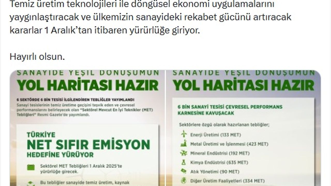 Konuyla ilgili sosyal medya hesabından açıklama yapan Çevre, Şehircilik ve İklim Değişikliği Bakanı Murat Kurum, "Sanayide yeşil dönüşüm yolunda önemli bir adım daha atıyoruz. '2053 Net Sıfır Emisyon' hedeflerimiz doğrultusunda; temiz üretim teknolojileri ile döngüsel ekonomi uygulamalarını yaygınlaştıracak ve ülkemizin sanayideki rekabet gücünü artıracak kararlar 1 Aralık'tan itibaren yürürlüğe giriyor. Hayırlı olsun" ifadelerini kullandı. (DHA)