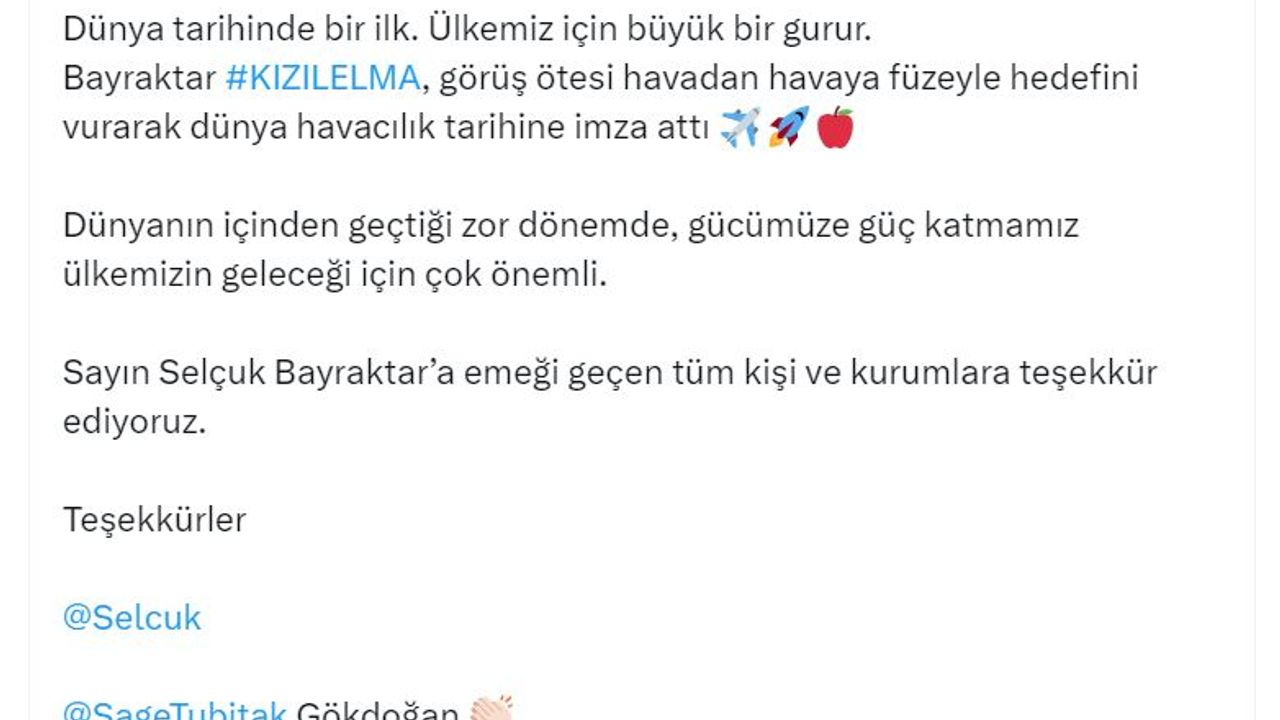 AK Parti Genel Başkan Yardımcısı ve Parti Sözcüsü Ömer Çelik de, "Dünya tarihinde bir ilk. Ülkemiz için büyük bir gurur. Bayraktar KIZILELMA, görüş ötesi havadan havaya füzeyle hedefini vurarak dünya havacılık tarihine imza attı. Dünyanın içinden geçtiği zor dönemde, gücümüze güç katmamız ülkemizin geleceği için çok önemli. Sayın Selçuk Bayraktar’a emeği geçen tüm kişi ve kurumlara teşekkür ediyoruz" değerlendirmesinde bulundu. (DHA)