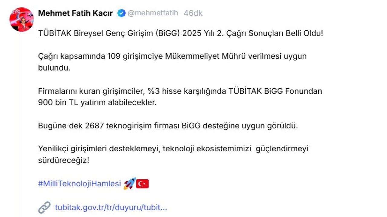Bakan Kacır, NSosyal hesabından yaptığı paylaşımda, "TÜBİTAK Bireysel Genç Girişim (BiGG) 2025 Yılı 2'nci Çağrısı sonuçları belli oldu. Çağrı kapsamında 109 girişimciye Mükemmeliyet Mührü verilmesi uygun bulundu. Firmalarını kuran girişimciler, yüzde 3 hisse karşılığında TÜBİTAK BiGG Fonundan 900 bin TL yatırım alabilecekler. Bugüne dek 2 bin 687 teknogirişim firması BiGG desteğine uygun görüldü. Yenilikçi girişimleri desteklemeyi, teknoloji ekosistemimizi güçlendirmeyi sürdüreceğiz" ifadelerini kullandı.