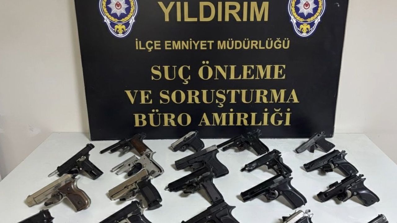 İl Emniyet Müdürlüğü Yıldırım Suç Önleme ve Soruşturma (SÖS) Büro Amirliği ekipleri tarafından Yıldırım ilçesindeki bir atölyede kaçak silah imalatı ve satışı yapıldığı bilgisine ulaşıldı. Belirlenen adreste 5 ruhsatsız tabanca, 14 kurusıkı tabanca, 27 şarjör, çeşitli çaplarda 63 fişek, silah yapımında kullanılan 14 araç gereç ve farklı türlerde toplam 19 silah parçası ele geçirildi. Atölyenin sahibi C.A. gözaltına alınırken, soruşturma sürüyor. (DHA)