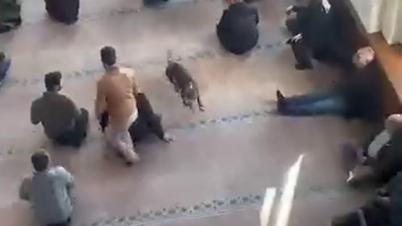 Erol POLAT/ÇAYIROVA(Kocaeli),(DHA) - KOCAELİ'nin Çayırova ilçesinde, Cuma namazı öncesi vaaz verildiği sırada camiye giren pitbull cinsi köpek cep telefonu kamerasıyla görüntülendi.