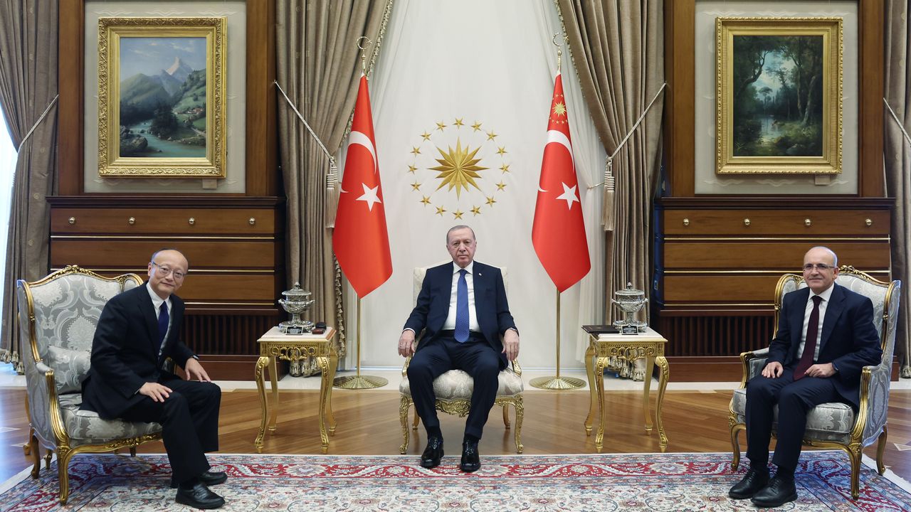 Cumhurbaşkanı Erdoğan, Asya Kalkınma Bankası Başkanı Masato Kanda'yı Cumhurbaşkanlığı Külliyesi'nde kabul etti. Kabulde, Hazine ve Maliye Bakanı Mehmet Şimşek de bulundu. (DHA)