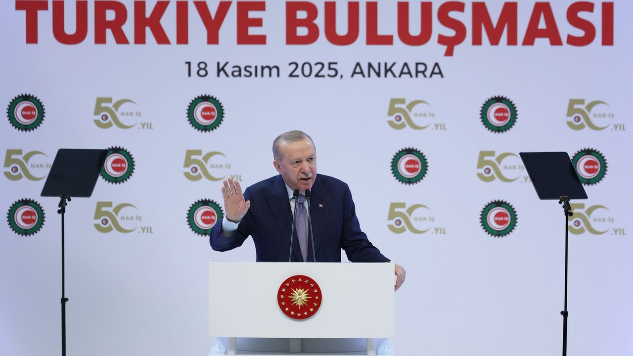 Cumhurbaşkanı Erdoğan, Hak İşçi Sendikaları Konfederasyonu (HAK-İŞ) 50'nci Yıl Etkinlikleri Kapsamında Ankara Ticaret Odası (ATO) Kongre ve Sergi Merkezi'nde düzenlenen '1'inci Türkiye Buluşması Programı'na katıldı. Burada konuşan Erdoğan, 50'nci yılın HAK-İŞ camiası ile sendikalar, emekçiler, çalışma hayatı, ülke ve millet için hayırlı olmasını dileyerek, "Türkiye'de kardeş kavgasının zirve yaptığı bir dönemde, bir nevi kardeşlik ve barış ocağı olarak kurulan HAK-İŞ Konfederasyonu'nun faaliyetlerinde emeği geçen herkesi yürekten tebrik ediyorum. HAK-İŞ çatısı altında emekçinin davasını; hakkın, hakikatin ve adaletin davasını savunanlardan ebedi aleme göç edenlere Rabb'imden gani gani rahmet niyaz ediyorum. HAK-İŞ’in eski Genel Başkanı, Çalışma Bakanımız, kıymetli yol ve dava arkadaşımız Necati Çelik’i bir kez de sizlerin huzurunda minnetle anıyorum. Hayatta olan dostlarımıza, büyüklerimize ve kardeşlerimize hayırlı, uzun, bereketli ömürler temenni ediyorum. Yine bu vesileyle özellikle iş kazalarında yitirdiğimiz işçi kardeşlerimizi rahmetle yad ediyor, Allah onlardan da razı olsun diyorum. HAK-İŞ bünyesinde örgütlü sendikal mücadeleye katılan 81 ilimizdeki 850 bin kardeşimin her birine buradan selam ve muhabbetlerimi gönderiyorum" dedi.