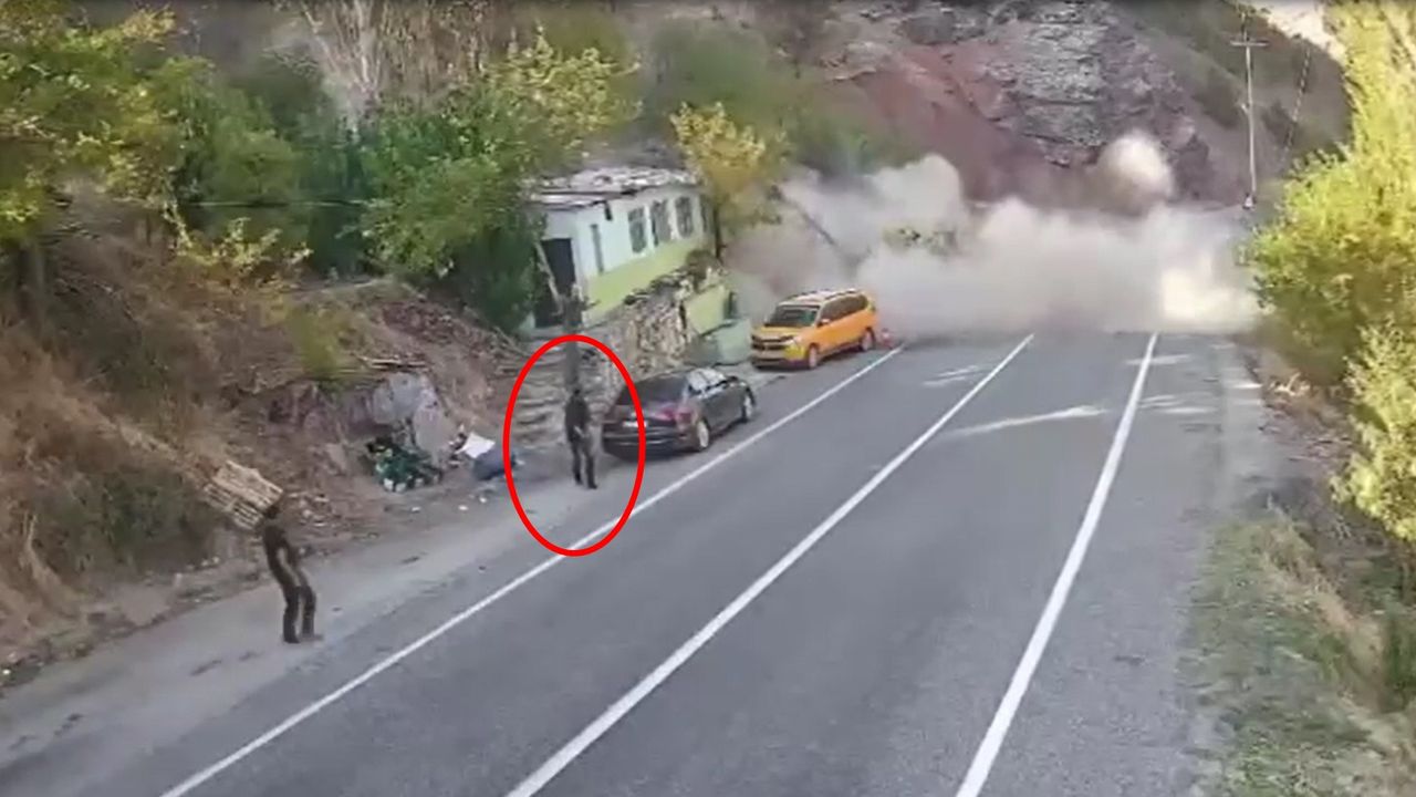 TUNCELİ’de yol kenarında bekleyen taksi şoförü, dağdan kopan kaya parçalarının altında kalmaktan başka birinin ‘Kaç’ uyarısıyla son anda kurtuldu. O anlar güvenlik kamerasına yansıdı.