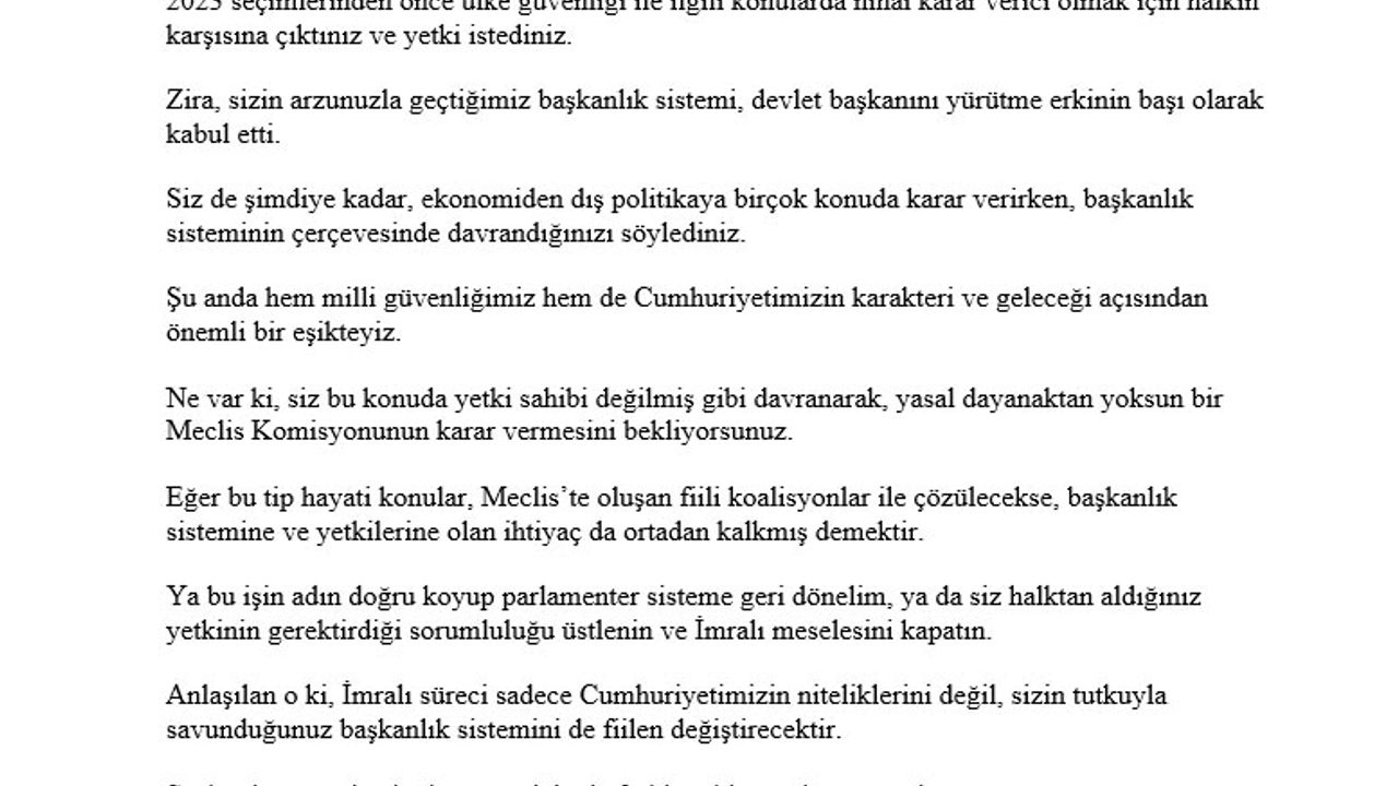 İYİ Parti Genel Başkanı Müsavat Dervişoğlu, mektubunda, "Sayın Cumhurbaşkanı; 2023 seçimlerinden önce ülke güvenliği ile ilgili konularda nihai karar verici olmak için halkın karşısına çıktınız ve yetki istediniz. Zira, sizin arzunuzla geçtiğimiz başkanlık sistemi, devlet başkanını yürütme erkinin başı olarak kabul etti. Siz de şimdiye kadar, ekonomiden dış politikaya birçok konuda karar verirken, başkanlık sisteminin çerçevesinde davrandığınızı söylediniz. Şu anda hem milli güvenliğimiz hem de Cumhuriyetimizin karakteri ve geleceği açısından önemli bir eşikteyiz. Ne var ki, siz bu konuda yetki sahibi değilmiş gibi davranarak, yasal dayanaktan yoksun bir Meclis Komisyonunun karar vermesini bekliyorsunuz. Eğer bu tip hayati konular, Meclis'te oluşan fiili koalisyonlar ile çözülecekse, başkanlık sistemine ve yetkilerine olan ihtiyaç da ortadan kalkmış demektir. Ya bu işin adını doğru koyup parlamenter sisteme geri dönelim, ya da siz halktan aldığınız yetkinin gerektirdiği sorumluluğu üstlenin ve İmralı meselesini kapatın. Anlaşılan o ki, İmralı süreci sadece Cumhuriyetimizin niteliklerini değil, sizin tutkuyla savunduğunuz başkanlık sistemini de fiilen değiştirecektir. Suskunluğunuzdan bu konuya sizin de farklı yaklaşmadığınızı anlıyorum. Eğer sizin böyle bir niyetiniz var ise, bunun teröristleri ve elebaşlarını meşrulaştırmadan da çözülebileceğini, Meclis'te yeniden parlamenter sisteme geçebilecek çoğunluğun rahatlıkla sağlanabileceğini düşünüyorum. Saygılarımla" ifadelerini kullandı. (DHA)
