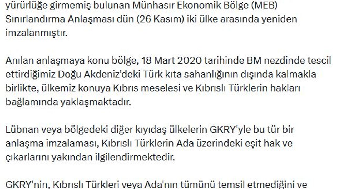 Dışişleri Bakanlığı Sözcüsü Öncü Keçeli, sosyal medya hesabından yaptığı açıklamada, "GKRY, 2003 yılından itibaren Kıbrıs Adası'nın egemen eşit unsuru olan Kıbrıslı Türkleri hiçe sayarak, bölgedeki kıyıdaş ülkelerle Kıbrıs Adası'nın etrafındaki deniz alanlarının sınırlandırılmasına ilişkin ikili anlaşmalar imzalamaktadır. Son olarak, Lübnan ile GKRY arasında 2007 yılında akdedilmiş ancak yürürlüğe girmemiş bulunan Münhasır Ekonomik Bölge (MEB) Sınırlandırma Anlaşması dün (26 Kasım) iki ülke arasında yeniden imzalanmıştır. Anılan anlaşmaya konu bölge, 18 Mart 2020 tarihinde BM nezdinde tescil ettirdiğimiz Doğu Akdeniz'deki Türk kıta sahanlığının dışında kalmakla birlikte, ülkemiz konuya Kıbrıs meselesi ve Kıbrıslı Türklerin hakları bağlamında yaklaşmaktadır" dedi.