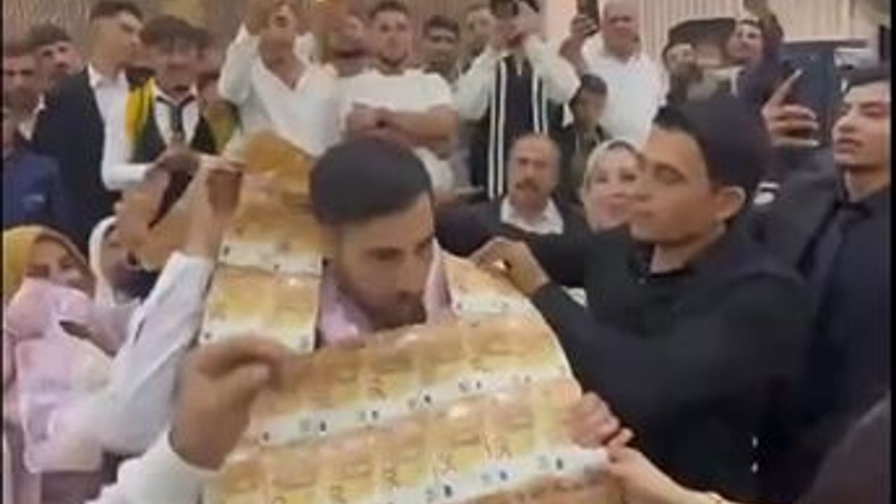 Kızıltepe ilçesinde hafta sonu yapılan aşiret düğününe Avrupa’dan gelen Nehir Vinç, damat olan kardeşi Halil İbrahim ile geline, valizle getirdiği 50 avro ve 200 Türk lirası banknotlarıyla yaptırdığı yeleği giydirdi. Vinç, çifte ayrıca 100 dolarla hazırlanan taçları taktı. Ağabeyinin takılarının çifti şaşırttığı görülen düğüne katılan davetliler ise ağabeyi uzun süre alkışladı. Gelin ve damadın üzeri banknotlarla kaplanırken, o anlar ise çevredekilerin cep telefonuyla görüntülendi. (DHA)