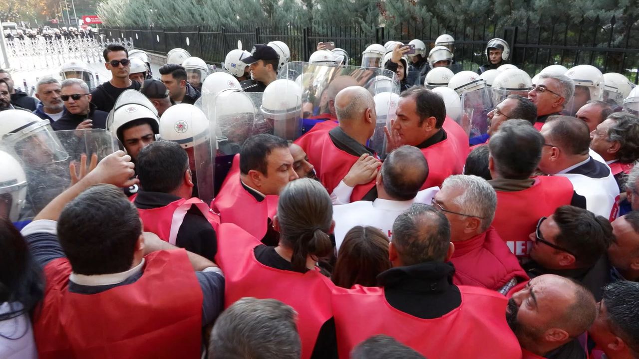 Eğitim-İş Sendikası üyeleri, Milli Eğitim Bakanlığı ve bağlı kuruluşların 2026 yılı bütçe görüşmelerinin gerçekleştirildiği TBMM'ye yürümek üzere bakanlık önünde toplandı. Üyelerin yürüyüşü, polis tarafından durduruldu. Yaşanan kısa süreli arbedenin ardından sendika üyeleri, sloganlar eşliğinde oturma eylemi yaptı. Eğitim-İş Genel Başkanı Kadem Özbay, "1 saattir emniyet mensuplarıyla görüşüyoruz. Ancak ülke o hale gelmiş ki trafiği engellemeden, ülkenin kaldırımlarından yürümek istediğimizi belirtmemize rağmen, 'asla olmaz' yanıtı veriyorlar. Bu bütçe, ülkedeki herkesi ilgilendiriyor. Biz de tüm yurttaşlarımızı buraya davet ediyoruz. Halkın önünde hiç kimse olamaz. Ankara'da bulunan tüm yurttaşlarımızı, demokratik kitle örgütü temsilcilerini davet ediyoruz" dedi. (DHA)