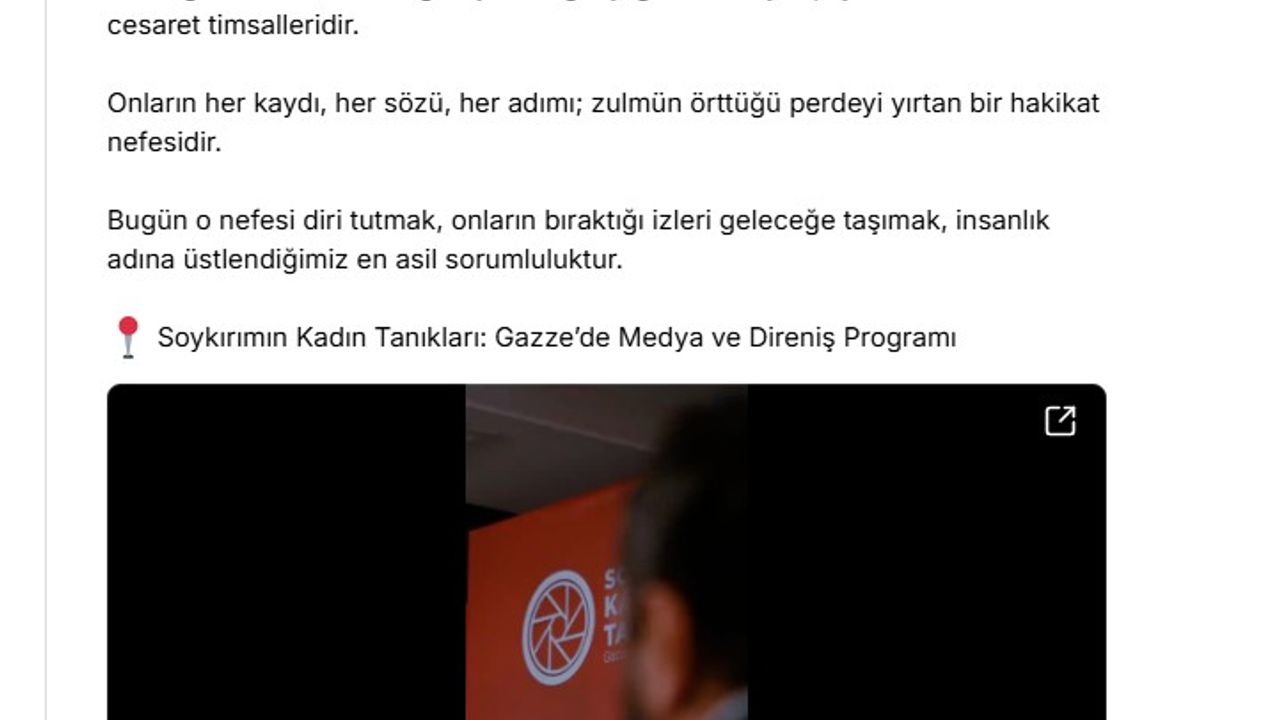 ANKARA, (DHA)- CUMHURBAŞKANI Recep Tayyip Erdoğan'ın eşi Emine Erdoğan, dün İletişim Başkanlığı'nda düzenlenen 'Soykırımın Kadın Tanıkları: Gazze'de Medya ve Direniş Programı'na ilişkin paylaşımda bulundu.