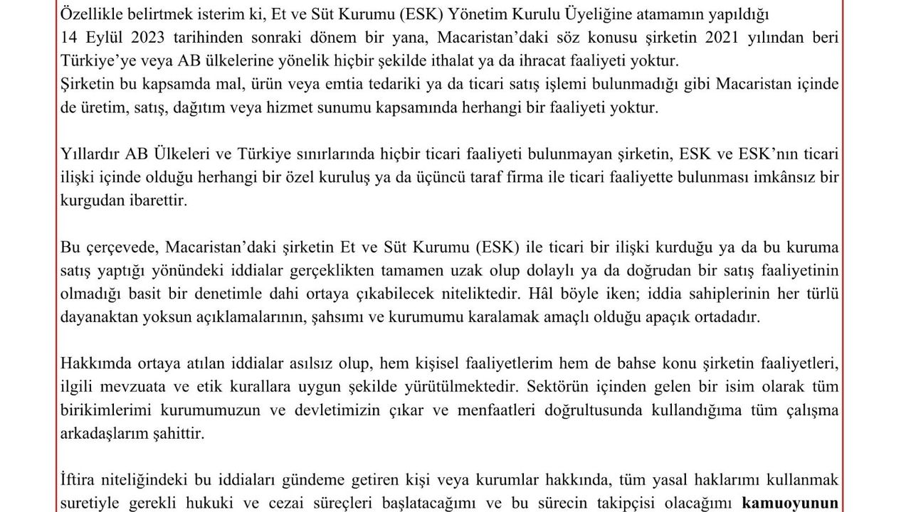 Öte yandan, konuyla ilgili açıklama yapan ESK Genel Müdürü ve Yönetim Kurulu Başkanı Mücahid Taylan, basın-yayın organlarında yer alan, kendisi ve Macaristan'da faaliyet gösterdiği iddia edilen bir şirketle ilgili ortaya atılan iddiaların gerçeği yansıtmadığını ifade etti. Taylan, "Son günlerde bazı basın-yayın organlarında şahsım ve Macaristan'da mukim şirket hakkında gerçeği yansıtmayan çeşitli iddialara yer verildiği görülmüştür. Kamuoyunun doğru bilgilendirilmesi amacıyla bu açıklamayı yapma gereği hasıl olmuştur. Özellikle belirtmek isterim ki Et ve Süt Kurumu (ESK) Yönetim Kurulu Üyeliğine atamamın yapıldığı 14 Eylül 2023 tarihinden sonraki dönem bir yana, Macaristan'daki söz konusu şirketin 2021 yılından beri Türkiye'ye veya AB ülkelerine yönelik hiçbir şekilde ithalat ya da ihracat faaliyeti yoktur. Şirketin bu kapsamda mal, ürün veya emtia tedariki ya da ticari satış işlemi bulunmadığı gibi Macaristan içinde de üretim, satış, dağıtım veya hizmet sunumu kapsamında herhangi bir faaliyeti yoktur. Yıllardır AB ülkeleri ve Türkiye sınırlarında hiçbir ticari faaliyeti bulunmayan şirketin, ESK ve ESK'nin ticari ilişki içinde olduğu herhangi bir özel kuruluş ya da üçüncü taraf firma ile ticari faaliyette bulunması imkansız bir kurgudan ibarettir” dedi.