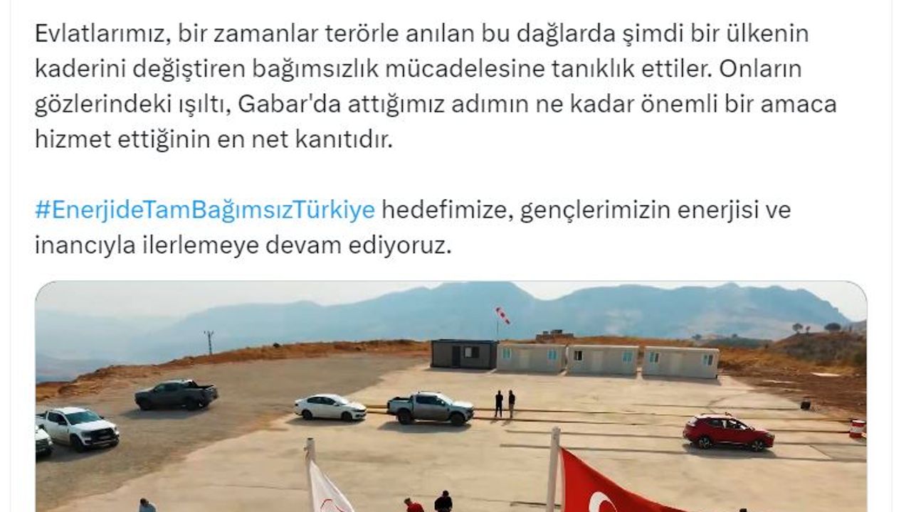 Öte yandan Enerji ve Tabii Kaynaklar Bakanı Alparslan Bayraktar, gençlerin Gabar ziyaretine ilişkin sosyal medya hesabından açıklama yaptı. Bakan Bayraktar, "Cumhurbaşkanımız Sayın Recep Tayyip Erdoğan’ın talimatı ile başlatılan ve Milli Eğitim Bakanlığımız tarafından yürütülen 'Maziden Atiye' programı kapsamında Türkiye'nin dört bir yanından gelen pırıl pırıl gençlerimizi, milli enerji vizyonumuzun kalbi Gabar’da ağırladık. Evlatlarımız, bir zamanlar terörle anılan bu dağlarda şimdi bir ülkenin kaderini değiştiren bağımsızlık mücadelesine tanıklık ettiler. Onların gözlerindeki ışıltı, Gabar'da attığımız adımın ne kadar önemli bir amaca hizmet ettiğinin en net kanıtıdır. Enerjide tam bağımsız Türkiye hedefimize, gençlerimizin enerjisi ve inancıyla ilerlemeye devam ediyoruz" ifadelerini kullandı. (DHA)