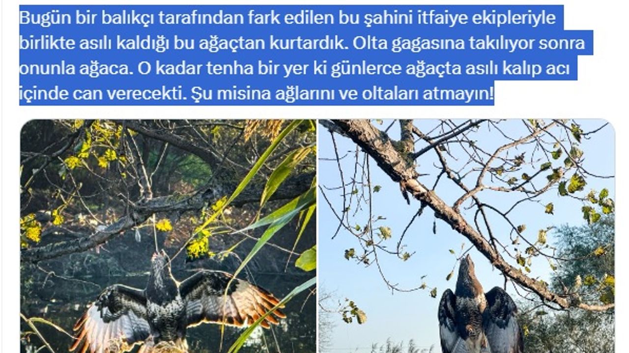Ekipler ile birlikte olay yerine giden doğa fotoğrafçısı Alper Tüydeş, sosyal medya hesabından şahinin oltaya takılı fotoğrafını paylaşıp, "Bugün bir balıkçı tarafından fark edilen bu şahini itfaiye ekipleriyle birlikte asılı kaldığı bu ağaçtan kurtardık. Olta gagasına takılıyor sonra onunla ağaca. O kadar tenha bir yer ki günlerce ağaçta asılı kalıp acı içinde can verecekti. Şu misina ağlarını ve oltaları atmayın" dedi. (DHA)