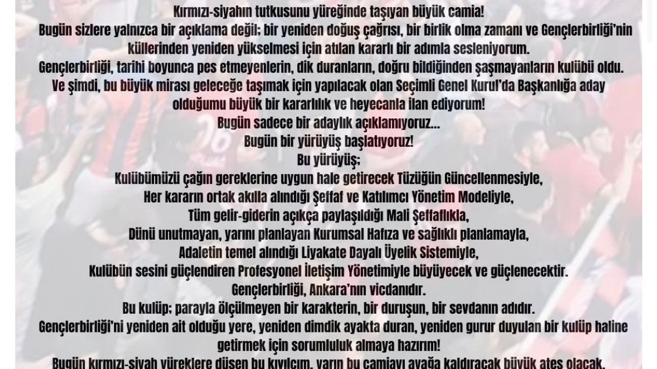 “Kırmızı-siyahın tutkusunu yüreğinde taşıyan büyük camia! Bugün sizlere yalnızca bir açıklama değil; bir yeniden doğuş çağrısı, bir birlik olma zamanı ve Gençlerbirliği'nin küllerinden yeniden yükselmesi için atılan kararlı bir adımla sesleniyorum. Gençlerbirliği, tarihi boyunca pes etmeyenlerin, dik duranların, doğru bildiğinden şaşmayanların kulübü oldu. Ve şimdi, bu büyük mirası geleceğe taşımak için yapılacak olan Seçimli Genel Kurul'da Başkanlığa aday olduğumu büyük bir kararlılık ve heyecanla ilan ediyorum! Bugün sadece bir adaylık açıklamıyoruz. Bugün bir yürüyüş başlatıyoruz! Bu yürüyüş; 'Kulübümüzü çağın gereklerine uygun hale getirecek Tüzüğün Güncellenmesiyle, Her kararın ortak akılla alındığı Şeffaf ve Katılımcı Yönetim Modeliyle, Tüm gelir-giderin açıkça paylaşıldığı Mali Şeffaflıkla, Dünü unutmayan, yarını planlayan Kurumsal Hafıza ve sağlıklı planlamayla, Adaletin temel alındığı Liyakate Dayalı Üyelik Sistemiyle, Kulübün sesini güçlendiren Profesyonel İletişim Yönetimiyle büyüyecek ve güçlenecektir.’ Gençlerbirliği, Ankara'nın vicdanıdır. Bu kulüp: parayla ölçülmeyen bir karakterin, bir duruşun, bir sevdanın adıdır. Gençlerbirliği'ni yeniden ait olduğu yere, yeniden dimdik ayakta duran, yeniden gurur duyulan bir kulüp haline getirmek için sorumluluk almaya hazırım! Bugün kırmızı-siyah yüreklere düşen bu kıvılcım, yarın bu camiayı ayağa kaldıracak büyük ateş olacak. Birlik olursak yapamayacağımız hiçbir şey yok! Haydi Gençlerbirliği ailesi, Güçlenme zamanı! Ayağa kalkma zamanı! Birlikte yeniden doğma zamanı! Saygı, sevgi ve büyük bir heyecanla... Çağrı ÇetinGençlerbirliği Başkan Adayı” (DHA)