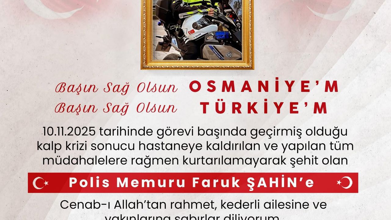 Osmaniye İl Emniyet Müdürlüğü tarafından paylaşılan başsağlığı mesajında, “10 Kasım günü Trafik Tescil ve Denetleme Şube Müdürlüğümüz kadrosunda görevli meslektaşımız polis memuru Faruk Şahin, görevi esnasında geçirdiği kalp krizi sonucu hastaneye kaldırılmış ve yapılan tüm müdahalelere rağmen kurtarılamayarak şehit olmuştur. Kahraman şehidimize Allah'tan rahmet, yakınlarına ve milletimize başsağlığı dileriz” denildi.