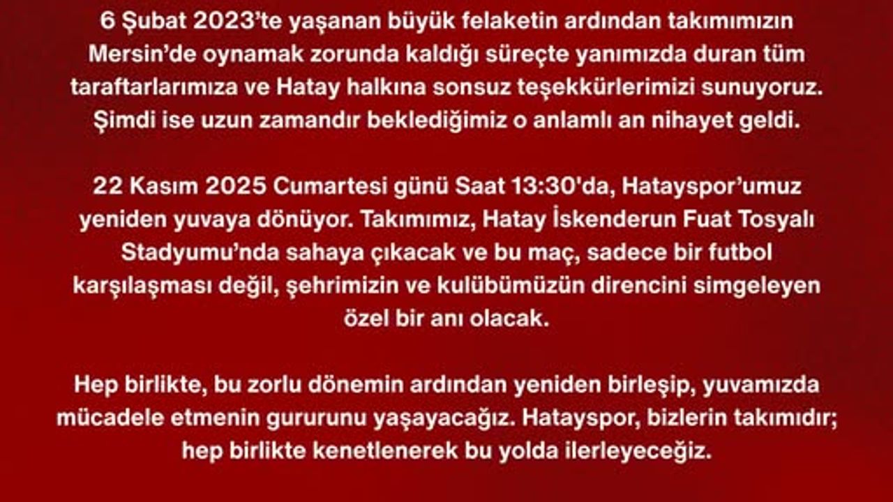 Kulüpten yapılan açıklamada; “Değerli Hatayspor Taraftarı ve Hatay Halkı, 6 Şubat 2023'te yaşanan büyük felaketin ardından takımımızın Mersin'de oynamak zorunda kaldığı süreçte yanımızda duran tüm taraftarlarımıza ve Hatay halkına sonsuz teşekkürlerimizi sunuyoruz. Şimdi ise uzun zamandır beklediğimiz o anlamlı an nihayet geldi. 22 Kasım günü Saat 13:30'da, Hataysporumuz yeniden yuvaya dönüyor. Takımımız, Hatay İskenderun Fuat Tosyalı Stadyumu'nda sahaya çıkacak ve bu maç, sadece bir futbol karşılaşması değil, şehrimizin ve kulübümüzün direncini simgeleyen özel bir anı olacak. Hep birlikte, bu zorlu dönemin ardından yeniden birleşip, yuvamızda mücadele etmenin gururunu yaşayacağız. Hatayspor, bizlerin takımıdır; hep birlikte kenetlenerek bu yolda ilerleyeceğiz. Bu anlamlı maçı hep birlikte izleyelim ve Hatay'ı yeniden ayağa kaldıralım” ifadelerine yer verildi. (DHA)