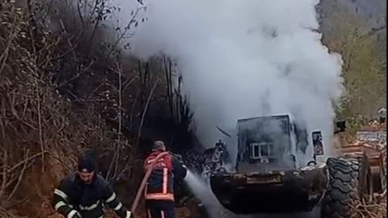 Ziya AKYILDIZ/ BORÇKA(Artvin), (DHA)- ARTVİN’in Borçka ilçesinde yol çalışması sırasında yanan iş makinesi, itfaiye ekiplerince söndürüldü. Yangın anları cep telefonu kamerasıyla görüntülendi.