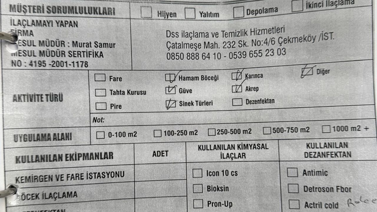 Otelde yapılan ilaçlama işlemine ait belge ortaya çıktı. 11 Kasım'da düzenlenen belgede, uygulamanın aylık olarak hamam böceği, güve, sinek türleri, karınca ve akrepten korunmak için yapıldığı görüldü. (DHA)