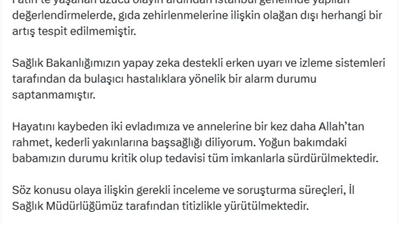 İstanbul İl Sağlık Müdürü Doç. Dr. Abdullah Emre Güner, kentteki gıda zehirlenmelerine ilişkin sosyal medya hesabından açıklamada bulundu. Güner, "Fatih’te yaşanan üzücü olayın ardından İstanbul genelinde yapılan değerlendirmelerde, gıda zehirlenmelerine ilişkin olağan dışı herhangi bir artış tespit edilmemiştir. Sağlık Bakanlığımızın yapay zeka destekli erken uyarı ve izleme sistemleri tarafından da bulaşıcı hastalıklara yönelik bir alarm durumu saptanmamıştır. Hayatını kaybeden iki evladımıza ve annelerine bir kez daha Allah’tan rahmet, kederli yakınlarına başsağlığı diliyorum. Yoğun bakımdaki babamızın durumu kritik olup tedavisi tüm imkanlarla sürdürülmektedir. Söz konusu olaya ilişkin gerekli inceleme ve soruşturma süreçleri, İl Sağlık Müdürlüğümüz tarafından titizlikle yürütülmektedir. Kamuoyuna saygıyla duyurulur" ifadelerini kullandı. (DHA)