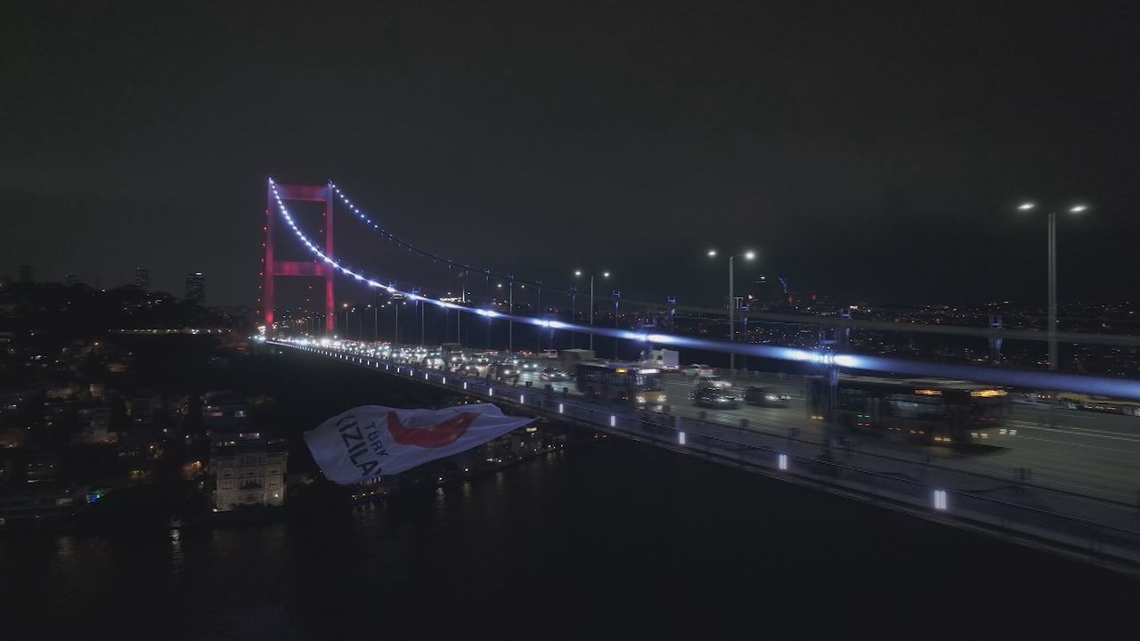 'İyiliğe devam' temasıyla 29 Ekim-4 Kasım tarihleri arasında kutlanan kutlanan 'Kızılay Haftası' sebebiyle Fatih Sultan Mehmet Köprüsü'nde Kızılay bayrağı dalgalandırıldı. Köprüye asılan bayrak dronla havadan görüntülendi. (DHA)
