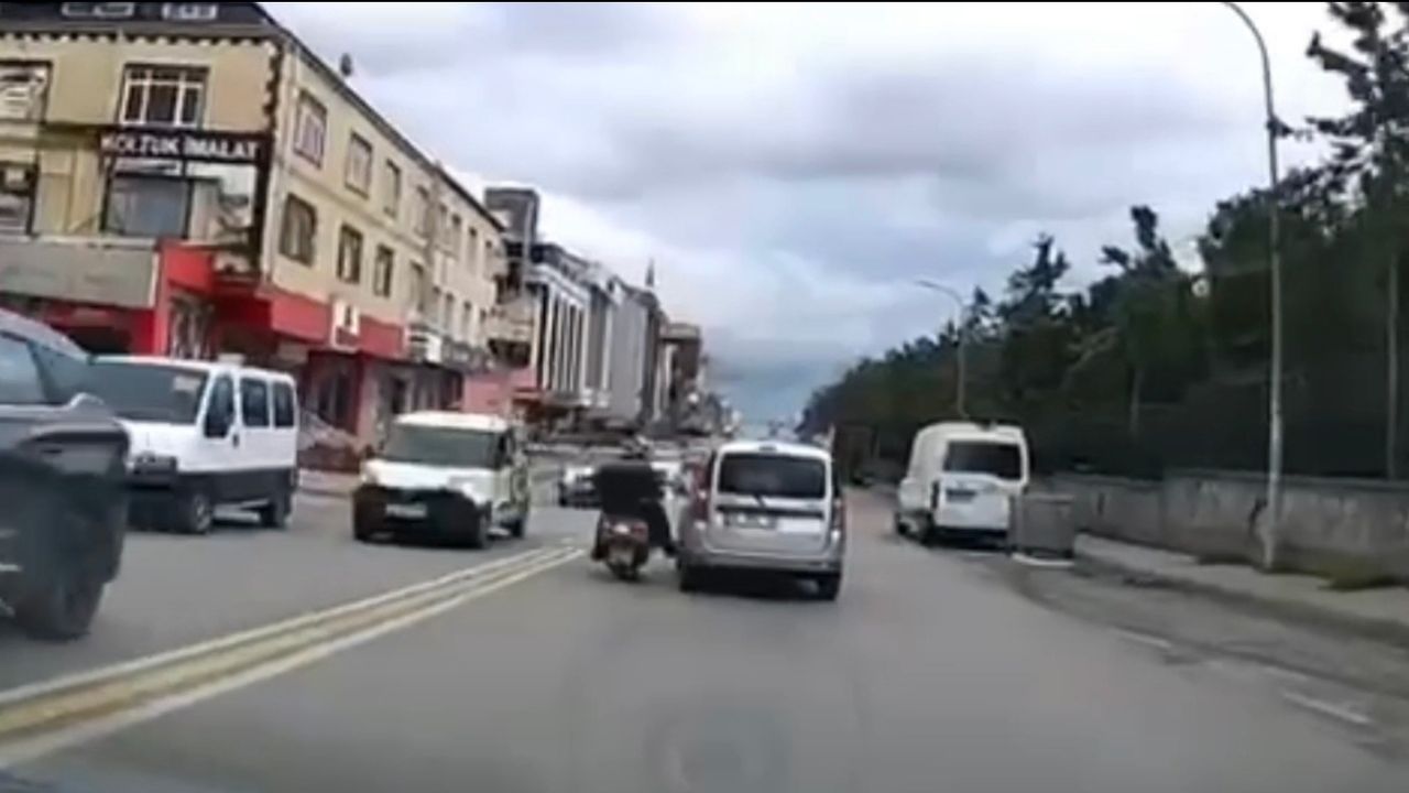 Motosikletli ile hafif ticari aracın sürücüsü arasında çıkan kavga başka bir sürücünün araç kamerasıyla kaydedildi. Görüntülerde, iki taraf arasında kavga çıkması ve motosikletlinin hafif ticari araca elindeki kaskla saldırdığı anlar yer aldı. (DHA)