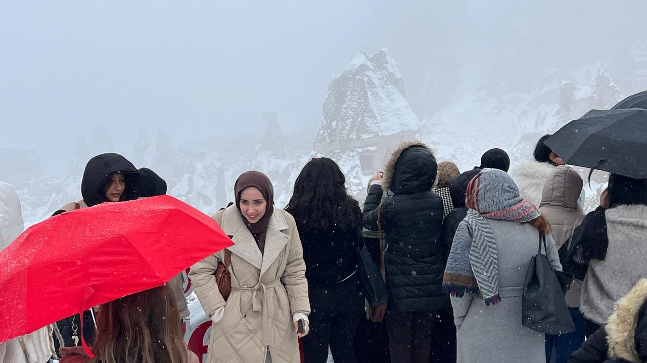 Hava sıcaklıklarının mevsim normallerinin altına düştüğü Kapadokya'da fırtına ve sağanak, yerini kar yağışına bıraktı. Bölgedeki peribacaları beyaza büründü. Göreme başta olmak üzere Ürgüp, Zelve ve Uçhisar gibi bölgeleri ziyaret eden turistler, kar yağışı sonrası Kapadokya'nın tadını çıkardı. Kapadokya'ya İstanbul'dan gelen Anıl Kaan, "Arkadaşlarımızla ilk defa geliyoruz. Kapadokya'ya gelirken kar bastırdı. Açıkçası bu durum hoşumuza da gitti. Herkes buranın kış ayında daha güzel olduğunu söylüyor. Eğleneceğiz, çok beğendik" diye konuştu. Balıkesir'den gelen Betül Pelvan ise "Uzun zamandır kar görmüyorduk, burada karı görünce şaşırdık, balon seyri için gelmiştik ama karı görünce çok mutlu olduk. Her yer çok güzel, şahane" dedi. (DHA)