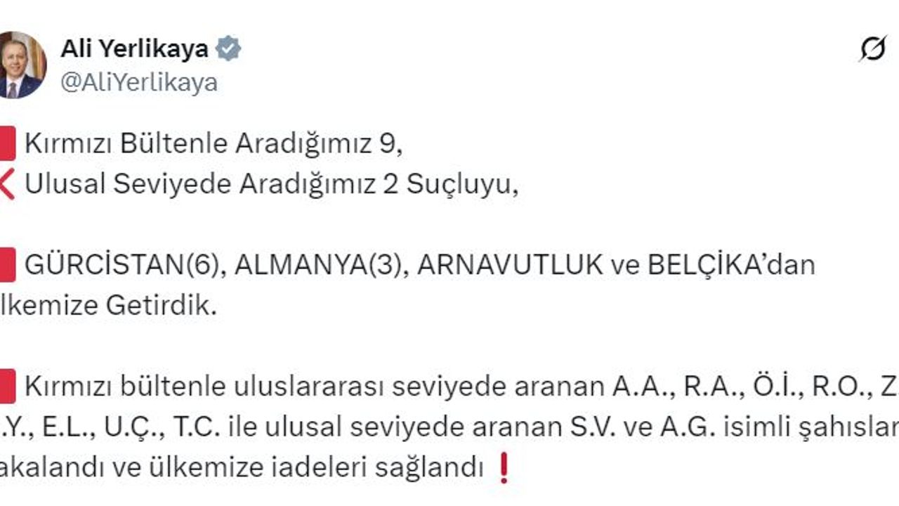 İÇİŞLERİ Bakanı Ali Yerlikaya, 9’u kırmızı bültenle, 2’si ise ulusal seviyede aranan toplam 11 suçlunun Gürcistan, Almanya, Arnavutluk ve Belçika'da yakalanarak Türkiye'ye getirildiğini duyurdu.