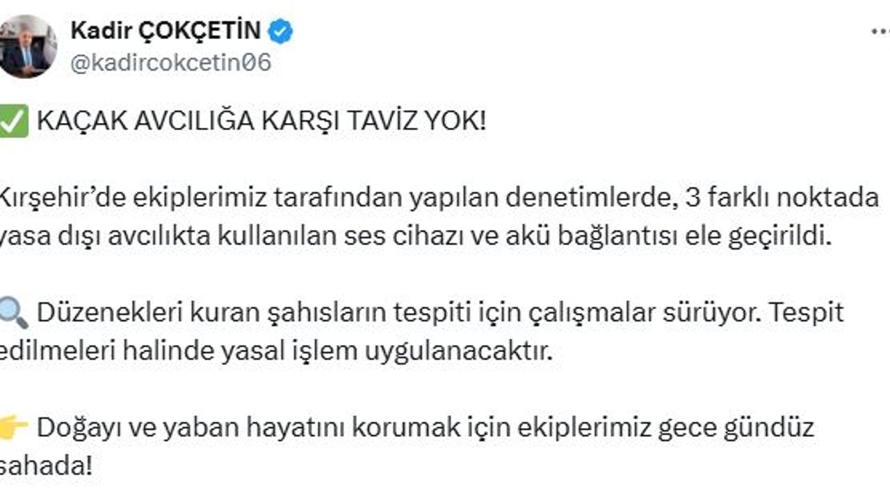 DKMP Genel Müdürü Çokçetin, sosyal medya hesabından yaptığı açıklamada, "Kırşehir'de ekiplerimiz tarafından yapılan denetimlerde, 3 farklı noktada yasa dışı avcılıkta kullanılan ses cihazı ve akü bağlantısı ele geçirildi. Düzenekleri kuran şahısların tespiti için çalışmalar sürüyor. Tespit edilmeleri halinde yasal işlem uygulanacaktır. Doğayı ve yaban hayatını korumak için ekiplerimiz gece gündüz sahada" dedi. (DHA)