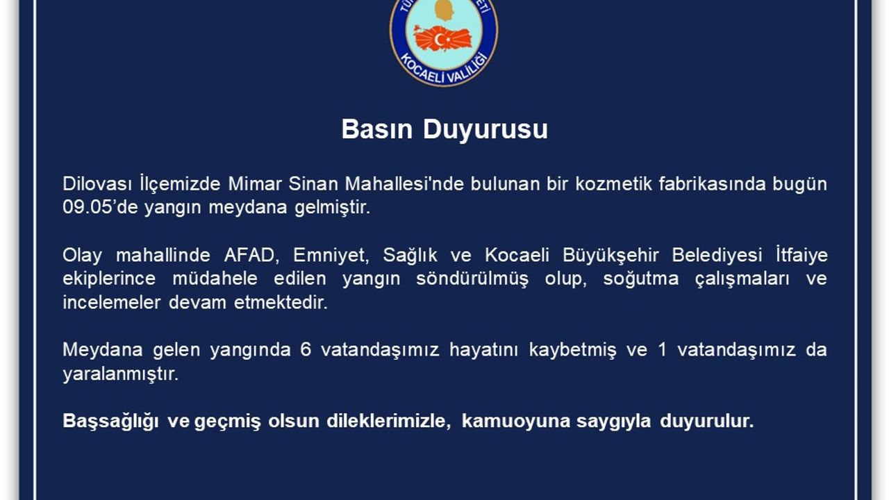 “Dilovası ilçemizde Mimar Sinan Mahallesi’nde bulunan bir kozmetik fabrikasında bugün saat 09.05’te yangın meydana gelmiştir. Olay mahallinde AFAD, Emniyet, Sağlık ve Kocaeli Büyükşehir Belediyesi İtfaiye ekiplerince müdahale edilen yangın söndürülmüş olup, soğutma çalışmaları ve incelemeler devam etmektedir. Meydana gelen yangında 6 vatandaşımız hayatını kaybetmiş ve 1 vatandaşımız da yaralanmıştır.” (DHA)
