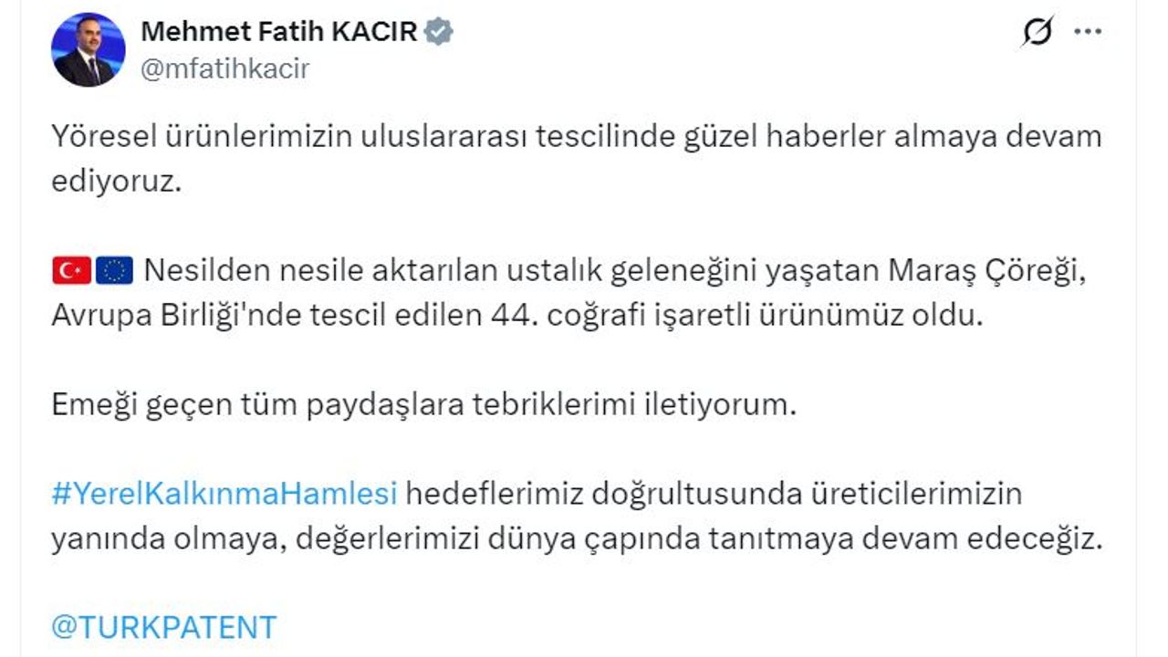 Bakan Yumaklı, sosyal medya hesabından yaptığı açıklamada, "Kahramanmaraş'ın asırları aşan lezzetleri sınırları da aşmaya devam ediyor. Maraş çöreği, Çağlayancerit cevizi ve Maraş tarhanasından sonra AB tarafından tescillenen bir başka Kahramanmaraş lezzeti oldu. Böylelikle AB'den tescilli ürün sayımız 44'e yükseldi" dedi.