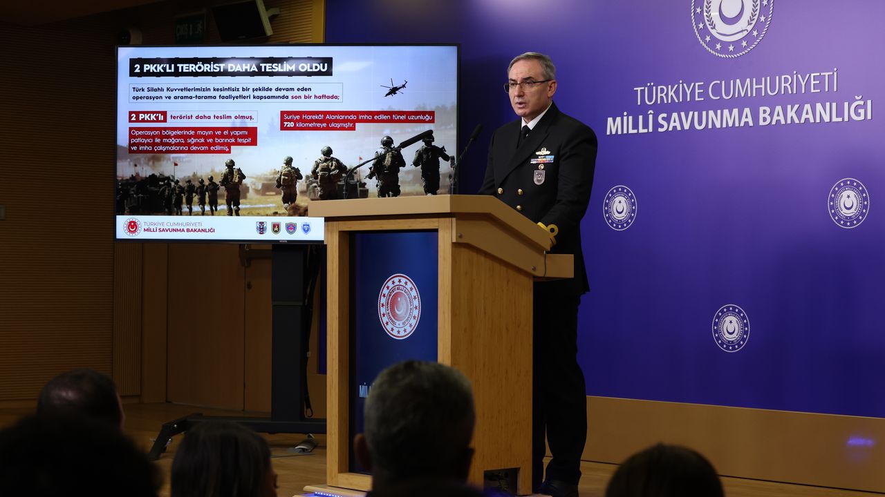 MSB Basın ve Halkla İlişkiler Müşaviri ve Bakanlık Sözcüsü Tuğamiral Zeki Aktürk, son 1 haftada yapılan faaliyetlere ilişkin bakanlıkta basın bilgilendirme toplantısı düzenledi. Tuğamiral Zeki Aktürk, son 1 haftada 2 PKK'lı teröristin teslim olduğunu, operasyon bölgelerinde mayın ve el yapımı patlayıcı ile mağara, sığınak ve barınak tespit ve imha çalışmalarına devam edildiğini, Suriye Harekat alanlarında imha edilen tünel uzunluğunun 720 kilometreye ulaştığını kaydetti. Tuğamiral Aktürk, hudut güvenliğine ilişkin de hafta boyunca yasa dışı yollarla sınırı geçmeye çalışan 1’i terör örgütü mensubu olmak üzere 244 kişinin yakalandığını, 707 kişinin ise hududu geçemeden engellendiğini, böylece, yıl içerisinde sınırlardan yasa dışı yollarla geçmeye çalışırken yakalananların sayısının 8 bin 545, hududu geçemeden engellenen kişi sayısının da 57 bin 345 olduğunu bildirdi. Aktürk, Hakkari hudut hattında 32 kilogram uyuşturucu ele geçirildiğini de ifade etti.
