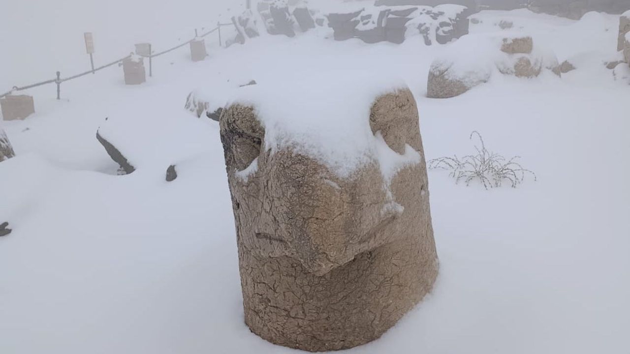 Meteoroloji’nin geçen günlerde sarı kodlu uyarısının ardından Adıyaman’da, UNESCO Dünya Mirası Listesi’nde bulunan Nemrut Dağı’nda kar yağışı etkili oldu. Yağışlar birlikte Nemrut Dağı beyaza büründü. 2 bin 206 metre yüksekliğe sahip zirvede, karla kaplanan Kommagene Krallığı’ndan kalma devasa heykeller ve tümülüsler, güzel görüntüler oluşturdu. (DHA)
