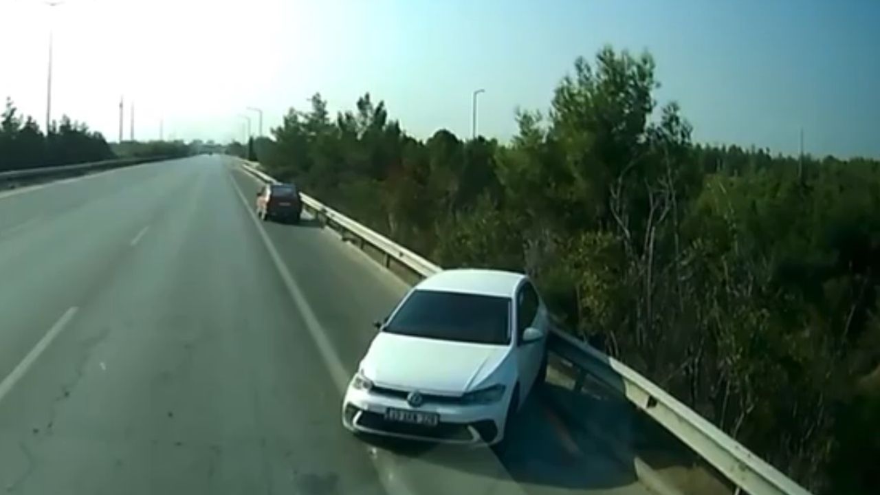 Kaza, 8 Kasım'da gündüz saatlerinde merkez Mezitli ilçesi Mersin-Çeşmeli Otoyolu Kuyuluk çıkışında meydana geldi. Otoyolda sol şeritte ilerleyen plakası ve sürücüsü öğrenilemeyen otomobil, aynı yön üzerinde duraklayan plakası ve sürücüsü öğrenilemeyen otomobile arkadan çarpıp, savruldu. Otomobiy, bariyerlere çarparak durabildi. Kazada yaralanan olmazken her iki araçta da maddi hasar meydana geldi. Öte yandan kaza anı, başka bir aracın yol kamerasına yansıdı. (DHA)
