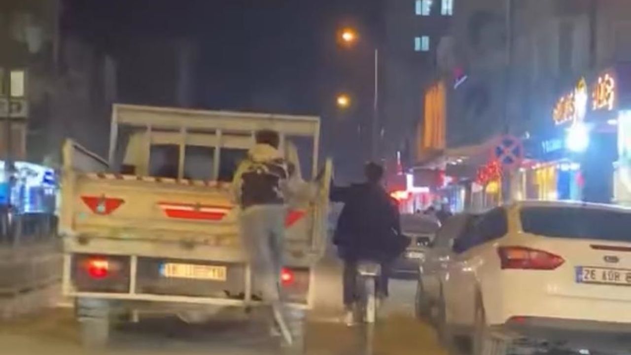 Olay, akşam saatlerinde Yenice Mahallesi Nuri Doğrul Caddesi üzerinde meydana geldi. Patenli ve bisikletli iki genç, seyir halindeki bir kamyonetin arkasına tutunarak bir süre trafikte ilerledi. Trafiği ve kendi can güvenliklerini tehlikeye atan 2 kişi, bir süre bu şekilde yolculuk etti. O anları gören bir vatandaş ise cep telefonu kamerasıyla tehlikeli yolculuğu kaydetti. Görüntülerde gençlerin zaman zaman dengesini kaybettiği görülürken, çevredeki sürücüler de duruma tepki gösterdi. (DHA)