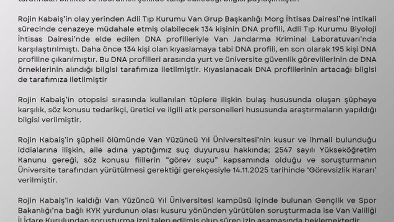 Yapılan açıklamada, Rojin Kabaiş’in şüpheli ölümü kapsamında Van Yüzüncü Yıl Üniversitesi’ne yönelik aile adına yapılan suç duyurusuna dair gelişmelere de yer verildi. Açıklamada, "Rojin Kabaiş'in şüpheli ölümünde Van Yüzüncü Yıl Üniversitesi'nin kusur ve ihmali bulunduğu iddialarına ilişkin, aile adına yaptığımız suç duyurusu hakkında, 2547 sayılı Yükseköğretim Kanunu gereği, söz konusu fillerin ‘görev suçu’ kapsamında olduğu ve soruşturmanın üniversite tarafından yürütülmesi gerektiği gerekçesiyle 14 Kasım 2025 tarihinde 'Görevsizlik Kararı' verilmiştir. Rojin Kabaiş'in kaldığı Van Yüzüncü Yıl Üniversitesi kampüsü içinde bulunan Gençlik ve Spor Bakanlığı'na bağlı KYK yurdunun olası kusuru yönünden yürütülen soruşturmada ise Van Valiliği İl İdare Kurulundan soruşturma izni talep edilmiş olup süreç izin aşamasında beklemektedir" denildi.