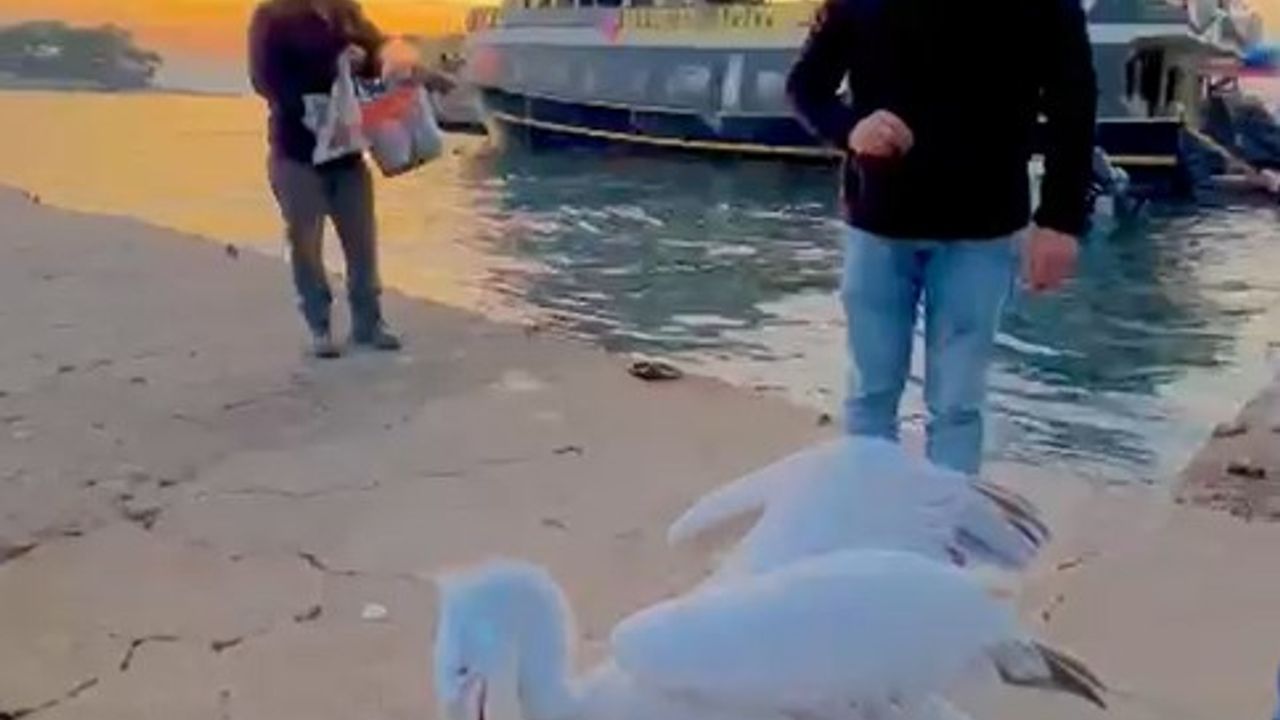 Görüntülerde; yüzerek sahile gelen pelikana, "Gel, gel koca gagalı. Gel koca gagalı" diyen bir vatandaş tarafından balık atıldığı, "Balık getirelim, dur, dur, biraz yedirelim ona" diyen kişinin peşinden pelikanın sahile çıktığı görüldü. Vatandaşın, "Sinirlenmek yok. Aferin. Kızmak yok, kızmak yok. Öyle sert hareketler yok" diye konuşup, pelikanı karada balıkla beslemeye devam ettiği anlar da görüntüye yansıdı. Pelikan, yere düşen balığı da alıp yedi. (DHA)