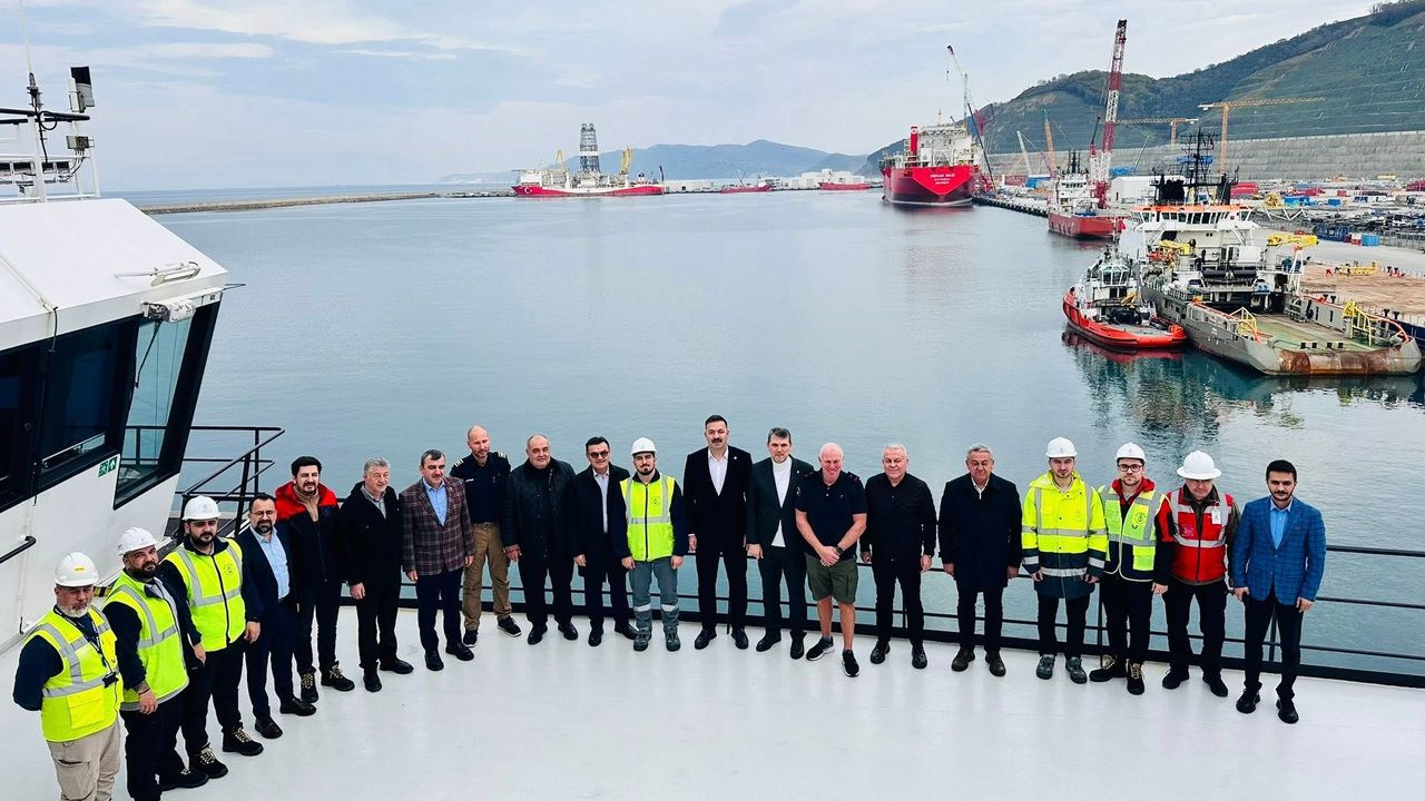 Derin deniz projeleri için özel tasarlanan, gelişmiş makaralı döşeme sistemi bulunan 43 metre uzunluğundaki Seven Vega gemisi, Faz 2 kapsamında deniz altına yerleştirilecek boru hatlarının kurulumunu yapacak. Kurulacak boru hattı ise Faz 2 kuyularından gelecek doğal gaz 2026’da göreve başlayacak Osman Gazi Yüzer Ünitesi’ne ulaştıracak. Gemi bu görevleri kapsamında, İstanbul’dan açılarak Zonguldak’ta bulunan doğalgaz işleme tesisi kurulu Filyos Limanı’na ulaştı. AK Parti Milletvekilleri Ahmet Çolakoğlu, Yusuf Aldatmaz ile Zonguldak İl Başkanı Mustafa Çağlayan ve Bartın İl Başkanı Yaşar Arslan, gemiyi ziyaret edip, incelemelerde bulundu.