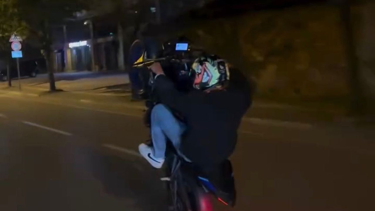 Yıldırım ilçesinde gece saatlerinde plakasız motosikleti ile tek teker üzerinde ilerleyen sürücü, trafiği tehlikeye attı. O anlar, başka bir sürücü tarafından cep telefonuyla görüntülendi. Polis ekipleri, sürücünün kimliği tespit edip, yakalamak için çalışma başlattı. (DHA)