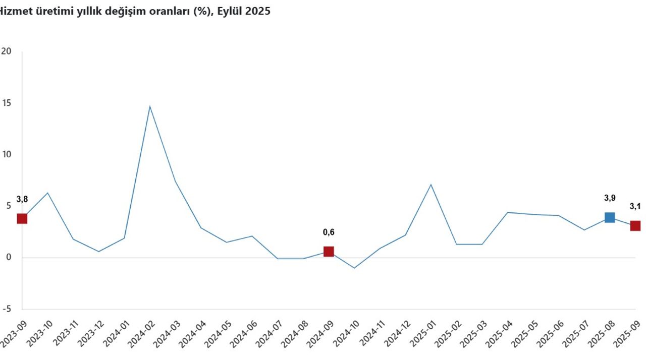 ANKARA, (DHA)- TÜRKİYE İstatistik Kurumu (TÜİK), eylül ayında hizmet üretiminin yıllık yüzde 3,1 arttığını, aylık yüzde 0,1 azaldığını açıkladı.